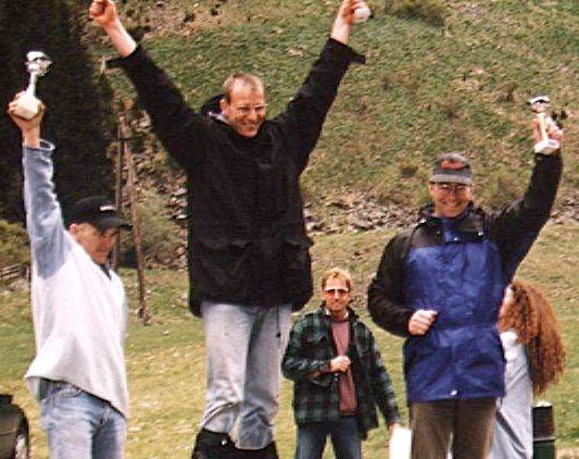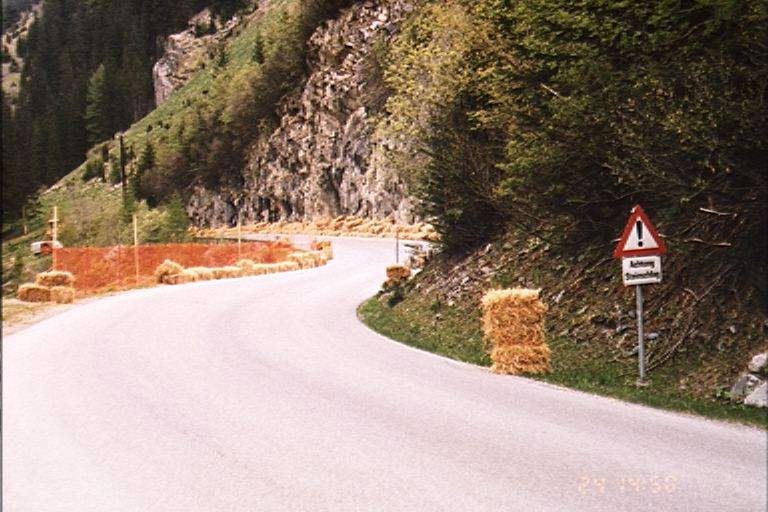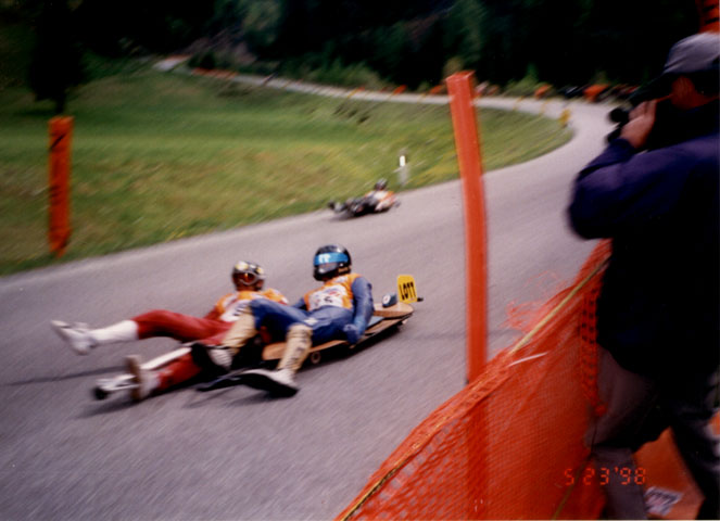 In 1998 the Hot Heels European Downhill Skate Championships added Street Luge as a racing category. This is the last chicane before the finish straight away. To win, a racer has to come in about 60 mph and clip the apex near the "Achtung!" sign, drifting out toward the orange safety fence. One foot on the other side of the plastic fencing is a 200 foot drop to a granite riverbed. The fence won't stop you from going over the cliff. Your only chance is to grab and tangle in it. On the way over, the fence will hopefully catch on trees and poles before you hit the bottom. This section is known as "Hell's Gate." |