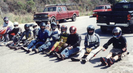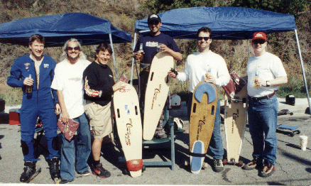 After 15 practice runs, John Cazin was the first out. He developed a raging headache by the the first race, stopping 20 yards short of the finish to let everyone else go by. Later John bought beers and fed half of the competitiors at his beautiful home. So much for sore losers. Danny Kinney and Brent Cooper were first time riders and did great racing against the world class field. Brent got his first boo boo in Levis and a borrowed leather jacket! Scott Peer is a world class In-liner who thought of the whole idea, raced, and supplied the hill and prizes (even cold beers for finishers 1 - 6). As the top non-luge pro, he definitely held his own. Jarret "Dr. GoFast" surpised everyone by gutting out a major migrane just to come to watch. As soon as he heard "RACE," he jumped off his death lounge, borrowed a demo board and asked, "Now where do I sit on this thing?" Awesome. Fun was the prime directive although there were rules for racing. Slingshoting was limited to practice and cutting into the oncoming lane was prohibited for the race. Hitting the cones was subject to DQ. But since none of the infractions affected race results, a substitute penalty was imposed. Both Perry and Jarret spent a round "On the Moon," a totally crap surface on the start line that no one would be caught dead on, unless it meant staying in for a "Second Chance" into the next heat. |