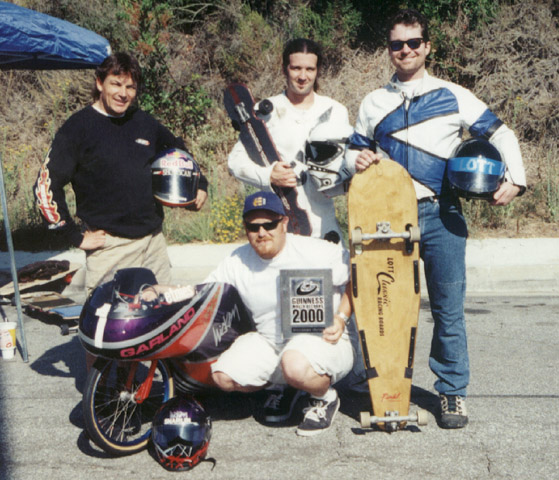 What do you do on a sunny Sunday afternoon if you're a World Speed Record holder looking to have some fun? If you're Darren Lott (buttboard), Tom Mason (street luge), "Snarlin" Dwight Garland (GPV), or Gary Hardwick (speedboard), you go to West LA College with your buddies for some riding! Buttboards, skateboards, GPV bikes, and inline skates were all in action on Sophomore Drive at West LA College, with lots of fun practice runs, and an elimination buttboard race. The race was on a 0.3 mile course, with 4 chicanes and one 90 degree left turn. Each run the last finisher was eliminated. The newest riders (including some riding their first time) were predictably eliminated early, then the heats got really tight. |