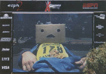 The top of the hill was hot and the riders baked sometimes as production delays or false starts held them on the start line. During a production hold while sitting on the start line Darren looked for some instant shade. One of the course workers supplied him with this box. Another rider drew the smile to match and "Box Head" was born! ESPN cameras captured it and this is a shot of over the Jumbotron. Darren's fiance Arlene liked "Box Head" so much she took a photo and they sent it out as a Christmas card that year. |