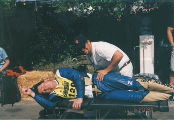 Chiropractor Paul Stately made a special visit to the pits to give Darren a hand during the competition. All the riders were really supportive and carried Darren's equipment, saved a special seat in the transport truck and let him lay on the equipment tables in the pits. During practice, competitior Ron Hanstein was following Darren down when Darren made a surprise braking move. Rather than take the chance of hitting and injuring Darren further, Ron purposely crashed into the hay to avoid him. The general public has no idea of how well the luge racers look out for one another behind the scenes. |